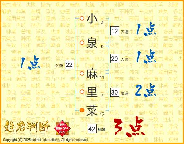 小(3画)泉(9画) 麻(11画)里(7画)菜(12画)