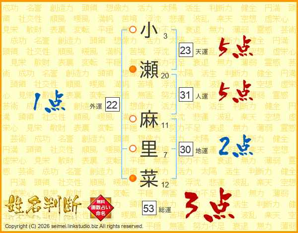 小(3画)瀬(20画) 麻(11画)里(7画)菜(12画)
