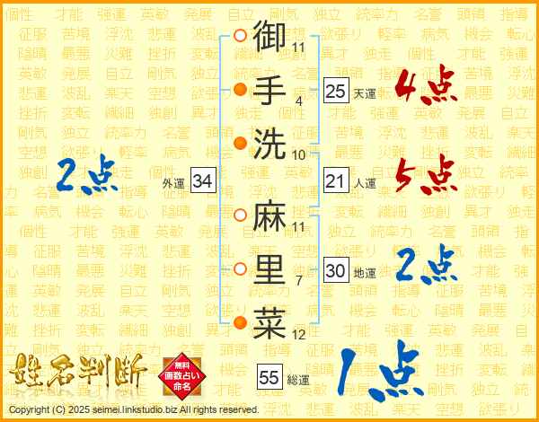 御(11画)手(4画)洗(10画) 麻(11画)里(7画)菜(12画)