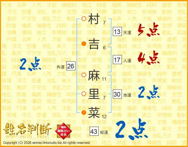 村(7画)吉(6画) 麻(11画)里(7画)菜(12画)
