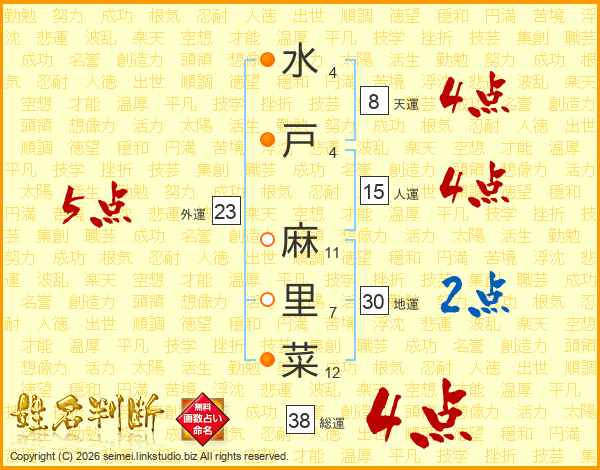 水(4画)戸(4画) 麻(11画)里(7画)菜(12画)