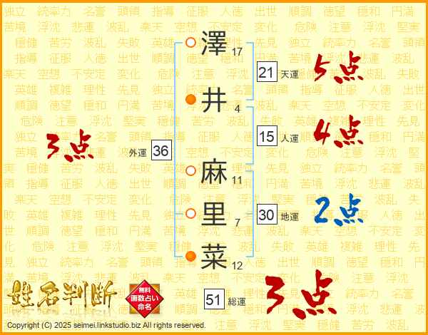 澤(17画)井(4画) 麻(11画)里(7画)菜(12画)