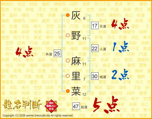 灰野麻里菜さんの総運は47画の5点!