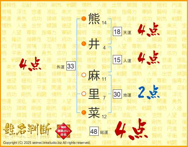 熊(14画)井(4画) 麻(11画)里(7画)菜(12画)