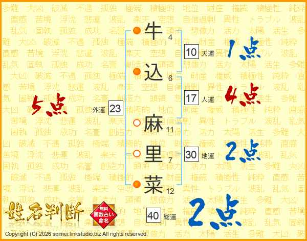 牛(4画)込(6画) 麻(11画)里(7画)菜(12画)