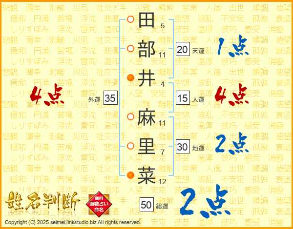 田(5画)部(11画)井(4画) 麻(11画)里(7画)菜(12画)