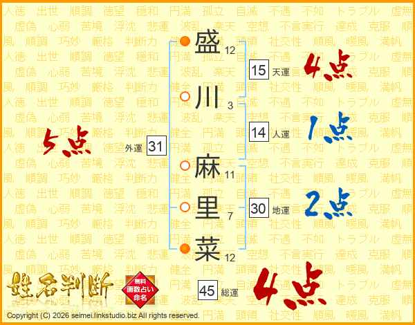 盛(12画)川(3画) 麻(11画)里(7画)菜(12画)