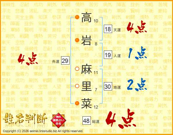 高(10画)岩(8画) 麻(11画)里(7画)菜(12画)