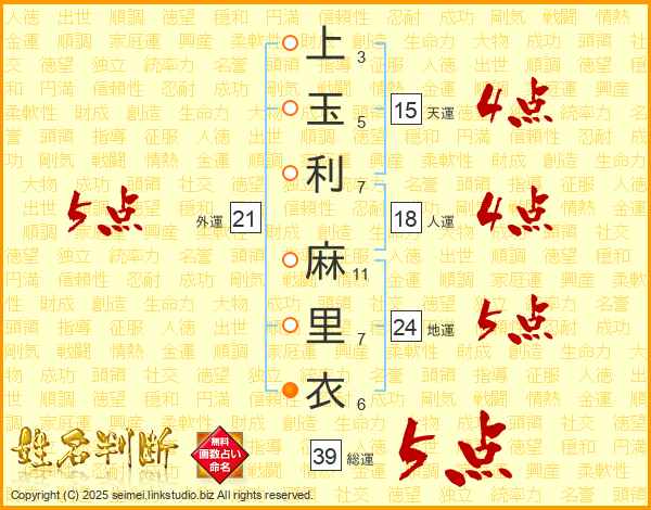上玉利麻里衣さんの総運は39画の5点!