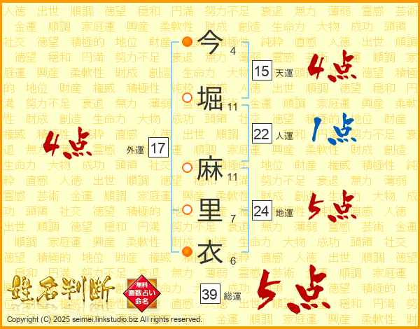 今(4画)堀(11画) 麻(11画)里(7画)衣(6画)