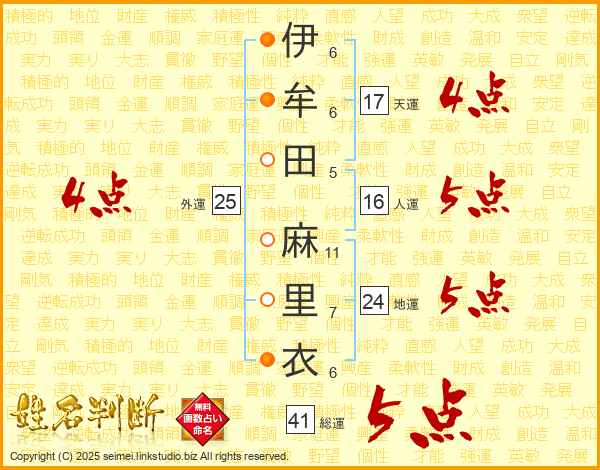 伊(6画)牟(6画)田(5画) 麻(11画)里(7画)衣(6画)