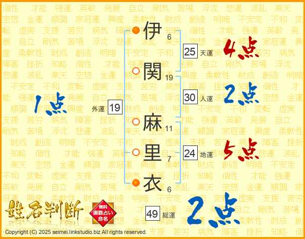 伊(6画)関(19画) 麻(11画)里(7画)衣(6画)