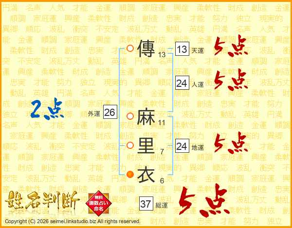 傳(13画) 麻(11画)里(7画)衣(6画)