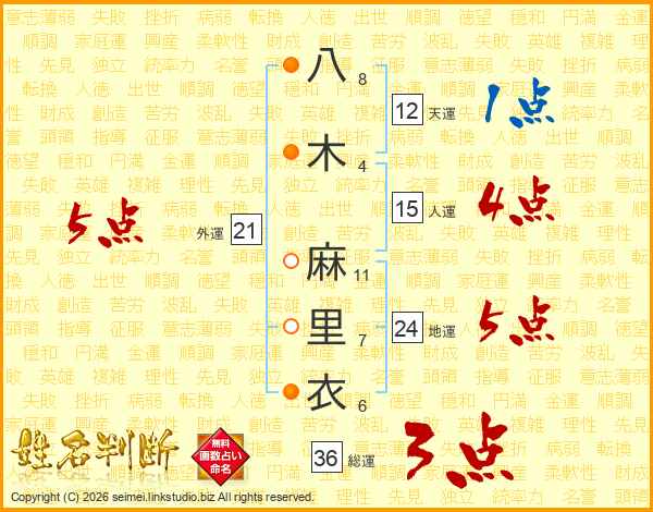 八(8画)木(4画) 麻(11画)里(7画)衣(6画)