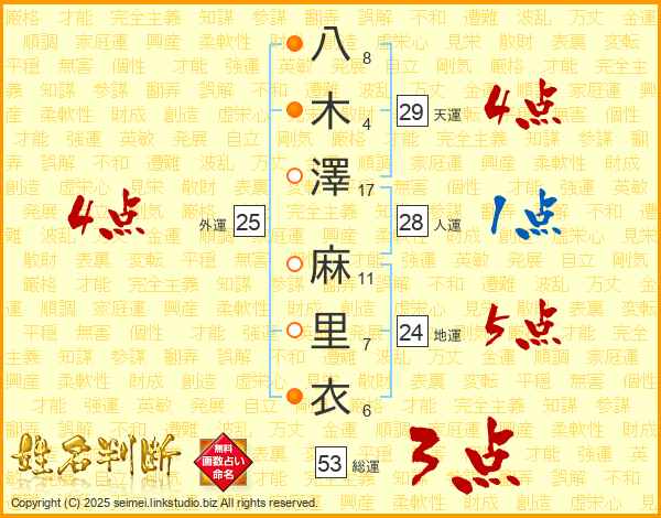 八木澤麻里衣さんの天運は29画の4点!