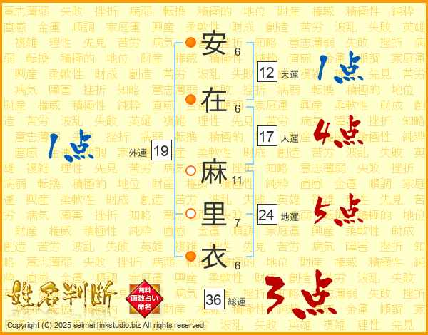 生活面を象徴する運勢です。外部から受ける影響力を表し、結婚運、家庭運や職場、環境への順応性を表します。総運から人運を引いた画数。姓や名が1文字の場合を除く。