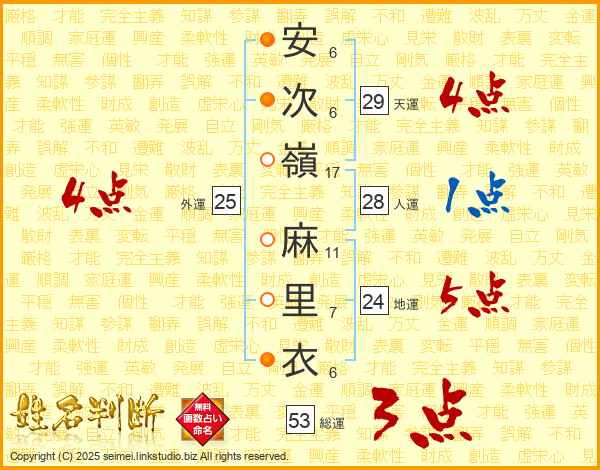 安(6画)次(6画)嶺(17画) 麻(11画)里(7画)衣(6画)