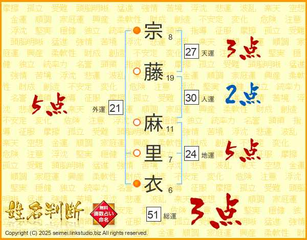 宗藤麻里衣さんの天運は27画の3点!