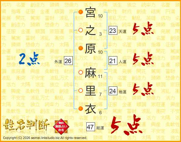 宮之原麻里衣さんの総運は47画の5点!