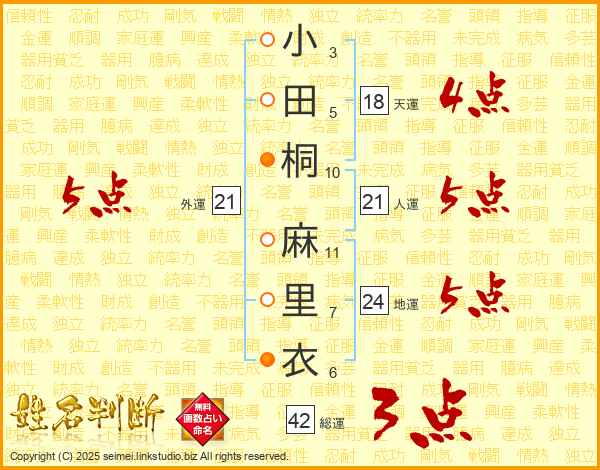 小(3画)田(5画)桐(10画) 麻(11画)里(7画)衣(6画)