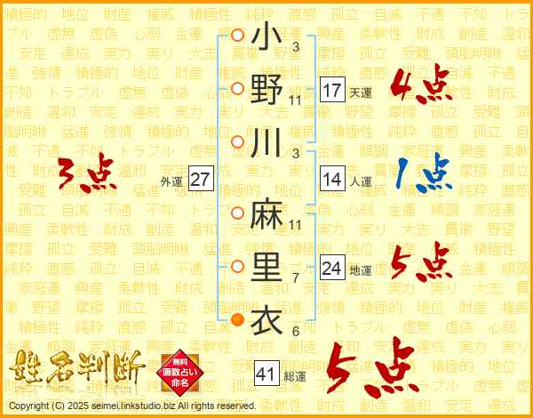 小(3画)野(11画)川(3画) 麻(11画)里(7画)衣(6画)