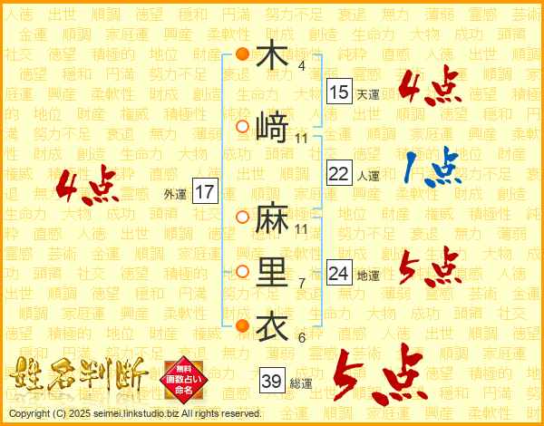 木(4画)﨑(11画) 麻(11画)里(7画)衣(6画)