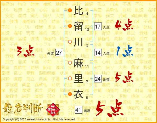 比(4画)留(10画)川(3画) 麻(11画)里(7画)衣(6画)