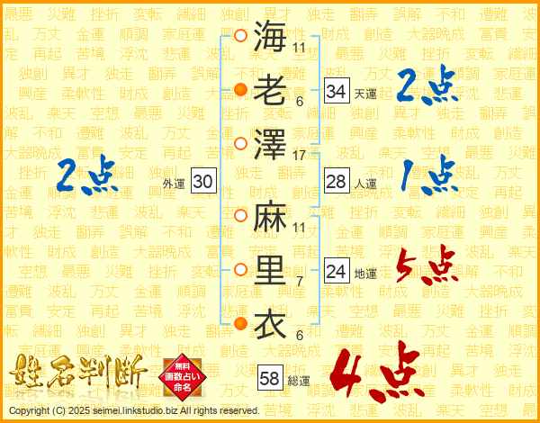 海(11画)老(6画)澤(17画) 麻(11画)里(7画)衣(6画)