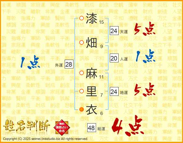 漆(15画)畑(9画) 麻(11画)里(7画)衣(6画)