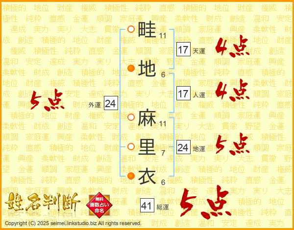 生活面を象徴する運勢です。外部から受ける影響力を表し、結婚運、家庭運や職場、環境への順応性を表します。総運から人運を引いた画数。姓や名が1文字の場合を除く。