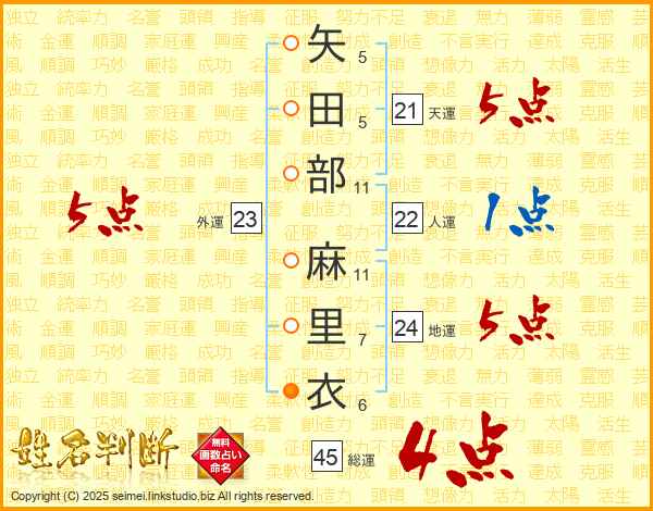 矢(5画)田(5画)部(11画) 麻(11画)里(7画)衣(6画)