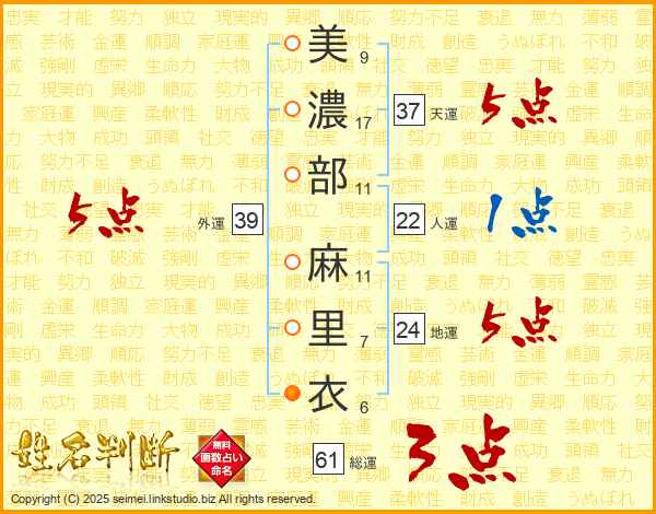 美(9画)濃(17画)部(11画) 麻(11画)里(7画)衣(6画)