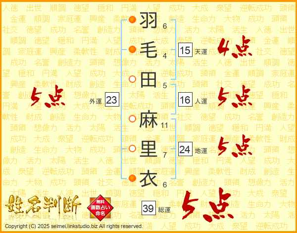 羽(6画)毛(4画)田(5画) 麻(11画)里(7画)衣(6画)