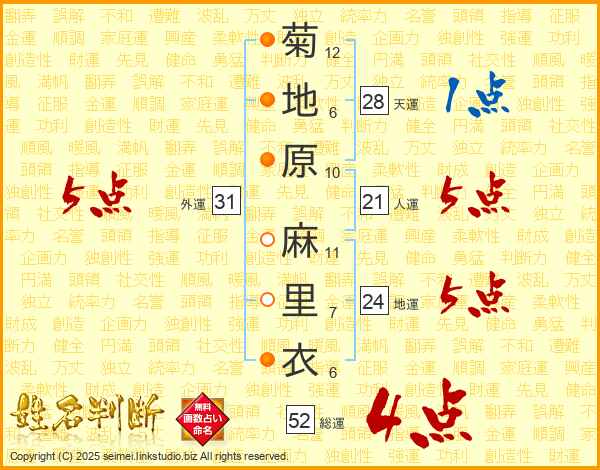 菊(12画)地(6画)原(10画) 麻(11画)里(7画)衣(6画)