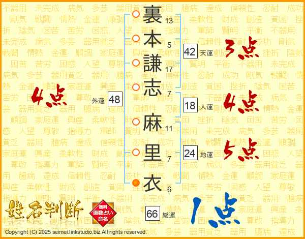 裏本謙志麻里衣さんの総運は66画の1点!