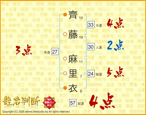 齊(14画)藤(19画) 麻(11画)里(7画)衣(6画)