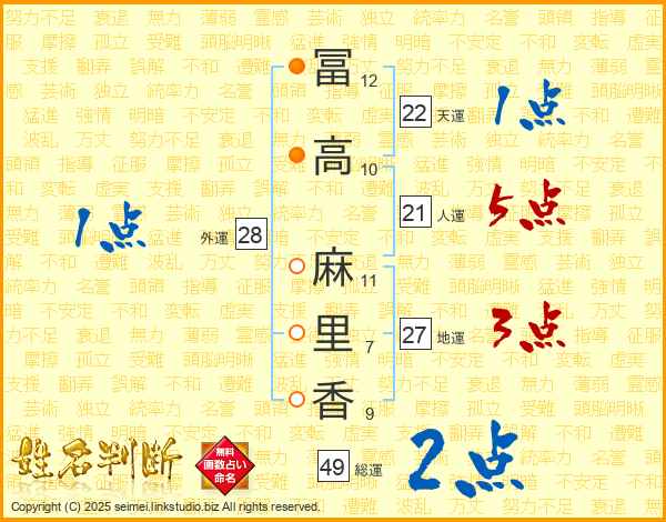 冨(12画)高(10画) 麻(11画)里(7画)香(9画)