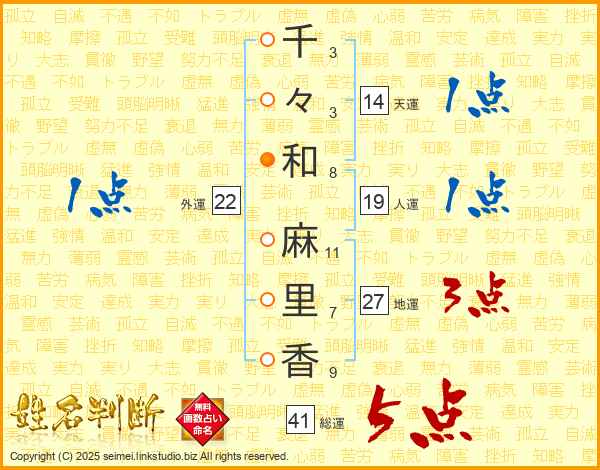 千(3画)々(3画)和(8画) 麻(11画)里(7画)香(9画)