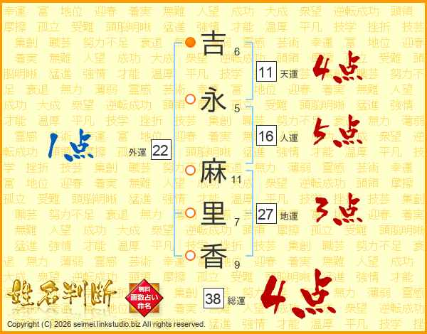 吉(6画)永(5画) 麻(11画)里(7画)香(9画)
