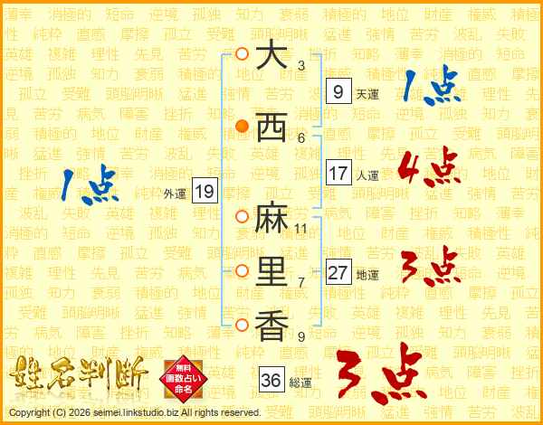 大(3画)西(6画) 麻(11画)里(7画)香(9画)