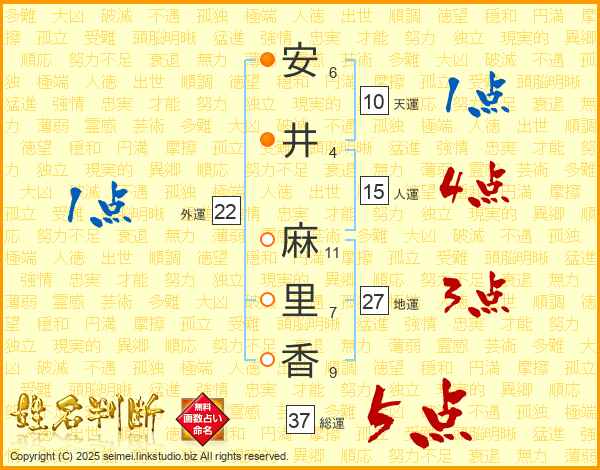 安(6画)井(4画) 麻(11画)里(7画)香(9画)