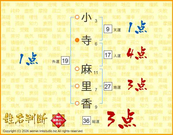 小(3画)寺(6画) 麻(11画)里(7画)香(9画)