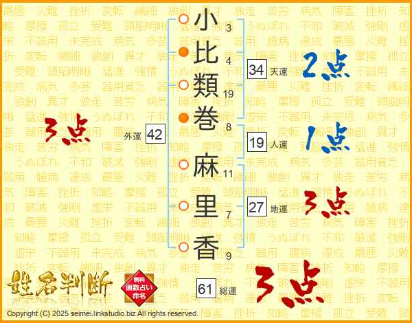小(3画)比(4画)類(19画)巻(8画) 麻(11画)里(7画)香(9画)