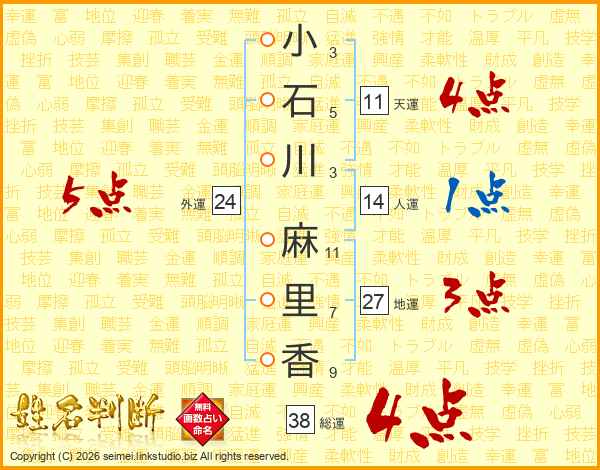 小(3画)石(5画)川(3画) 麻(11画)里(7画)香(9画)