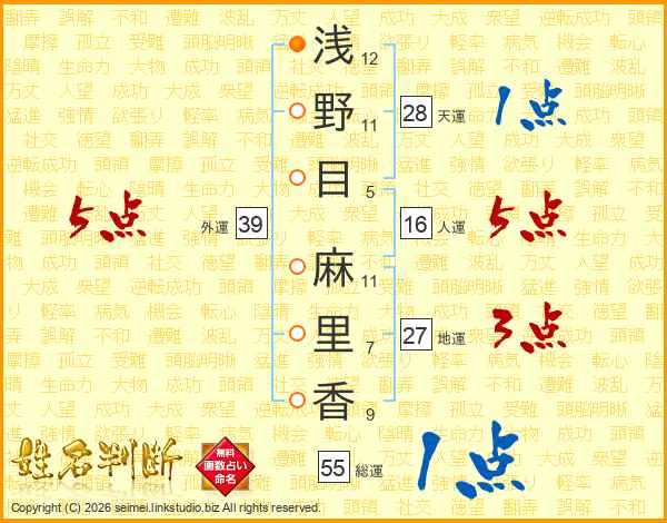 浅(12画)野(11画)目(5画) 麻(11画)里(7画)香(9画)