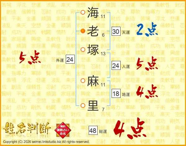 海(11画)老(6画)塚(13画) 麻(11画)里(7画)