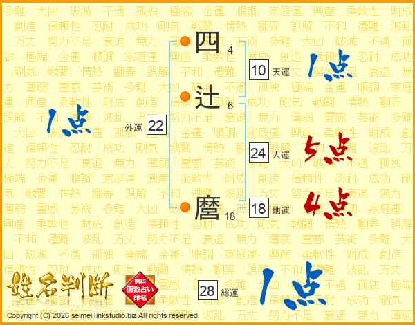 生活面を象徴する運勢です。外部から受ける影響力を表し、結婚運、家庭運や職場、環境への順応性を表します。総運から人運を引いた画数。姓や名が1文字の場合を除く。