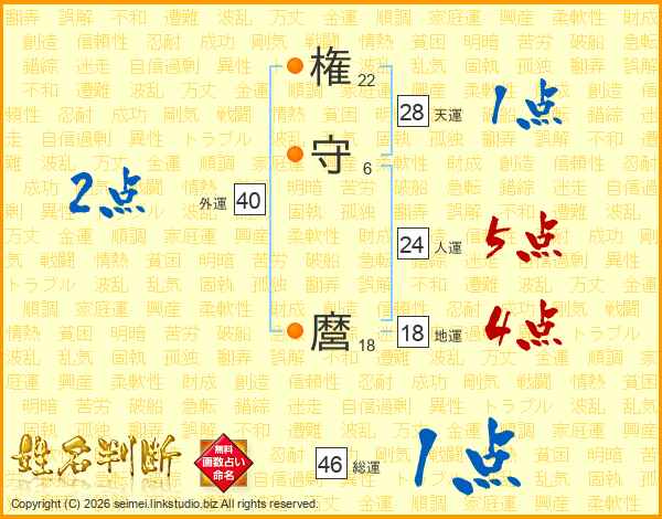 権守麿さんの総運は46画の1点!