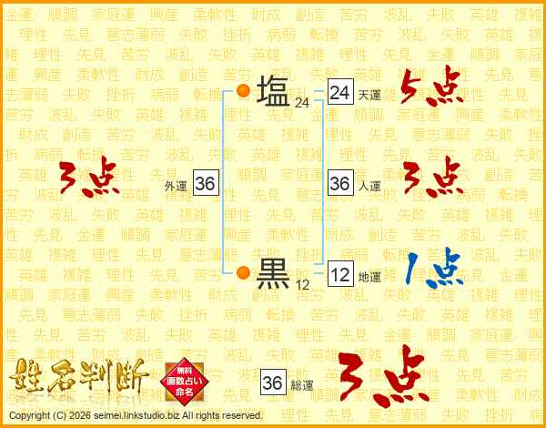 生活面を象徴する運勢です。外部から受ける影響力を表し、結婚運、家庭運や職場、環境への順応性を表します。総運から人運を引いた画数。姓や名が1文字の場合を除く。