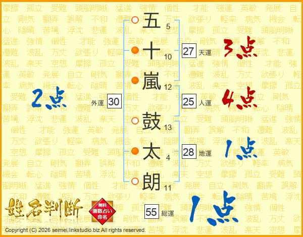五(5画)十(10画)嵐(12画) 鼓(13画)太(4画)朗(11画)